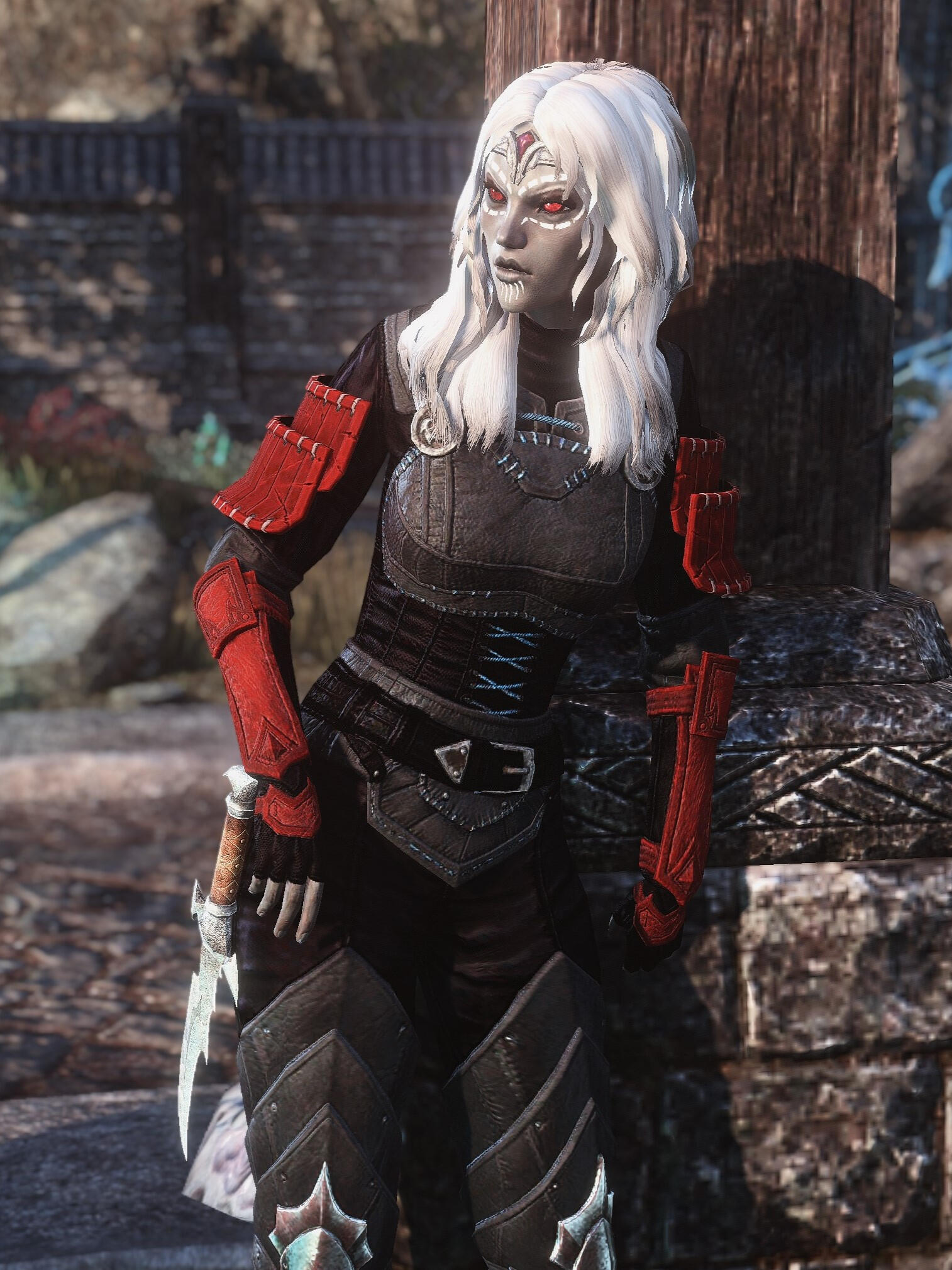 A Dunmer girl, cultured scoundrel, with stark white hair and smooth gray skin, born of Blacklight, a skilled marksman, a headstrong and certain person, and ruthless and efficient Mercenary and Bounty Hunter.Vyvene's profession has afforded her the opportunity to travel all across the territory of the Ebonheart Pact, and even beyond. She frequents many locales in her homeland of Morrowind, and can make a special trip, just for you.
