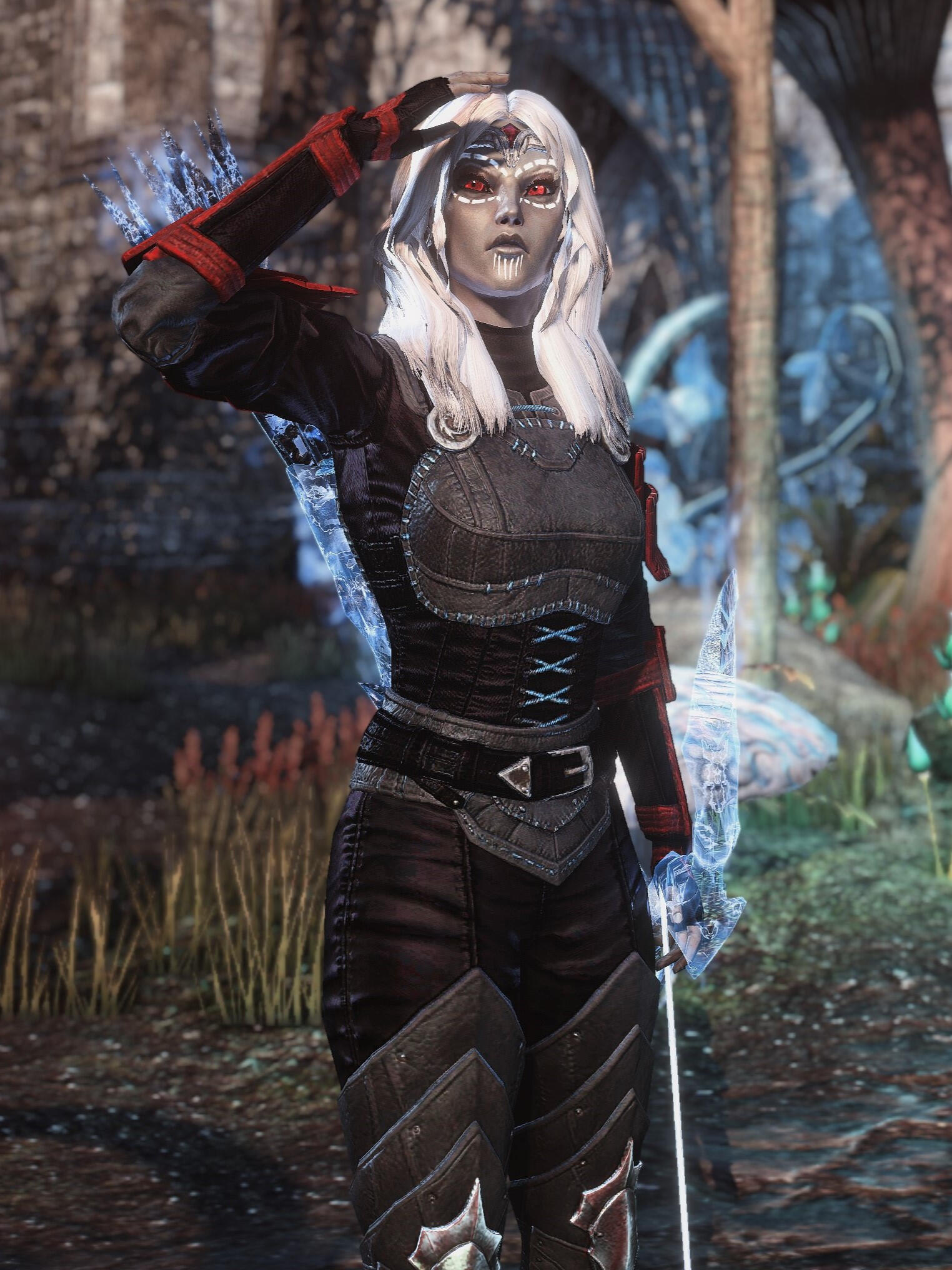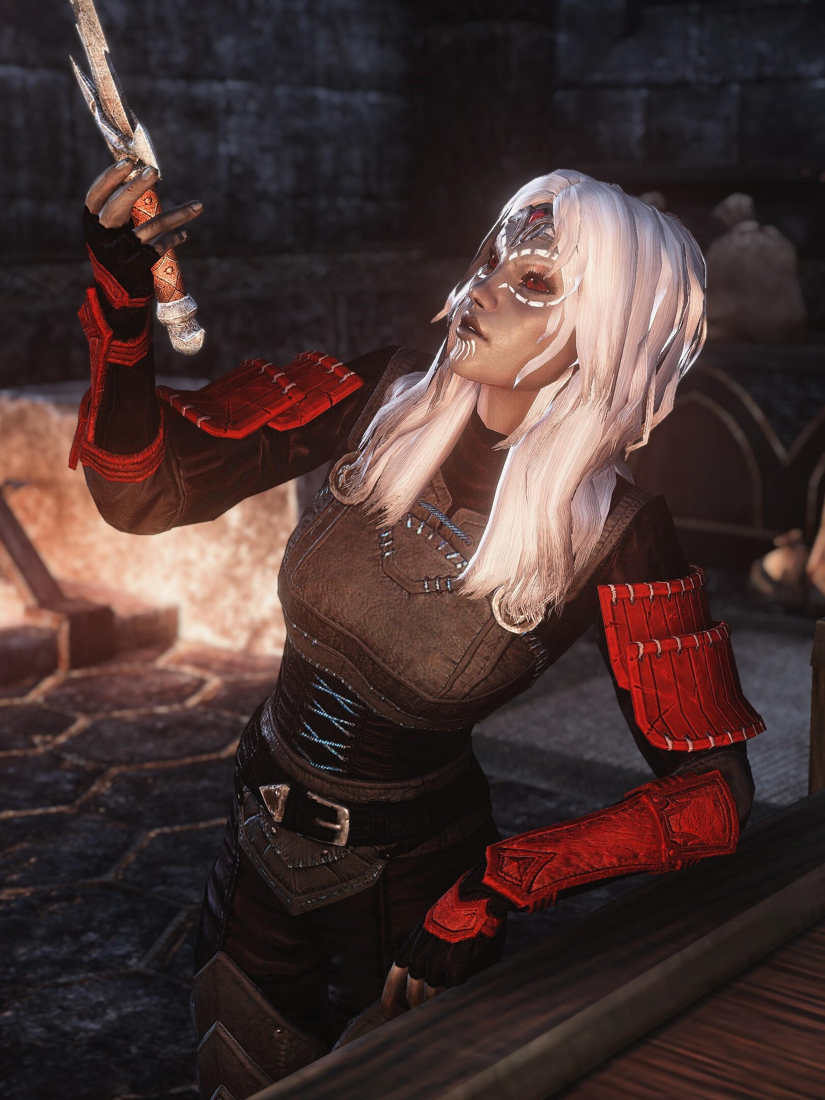 Vyvene was born and raised in the city of Blacklight - the coldest city in morrowind, and the capitol of House Redoran. A warrior-esque culture prevails in the Redoran District, and Vyvene followed in the footsteps of her father, who was a bounty hunter before her. Having no familial ties to the Redoran Council, Vyvene never sought a career in poilitcs, though the subject of politics interests her, particularly in realms of idealism and how society could be better.However, that quasi-revolutionary idealism manifested itself in the arts. Vyvene, before becoming a full-time Bounty Hunter, was an aspiring and unknown artist, sculptor, and designer. Most of her art was dadaist or provocative in nature, though she had a very stark appreciation for finer arts and was semi-skilled in fine art.Vyv has a marked appreciation for practicality, however, though not at all in a 'safe' bourgeois sense. Less is more, and her refusal to use physical weapons in favor of bound spectral weapons is both laughably impractical as well as stunningly practical in a roundabout way. Of course, the artistry of daedric weapons is unmatched by mortal hands, and the color contrast of the blue weapon held by an arm adorned by a red bracer adds a little contrast and intention mixed in what are otherwise quite basic materials and fashioning.Bullet points