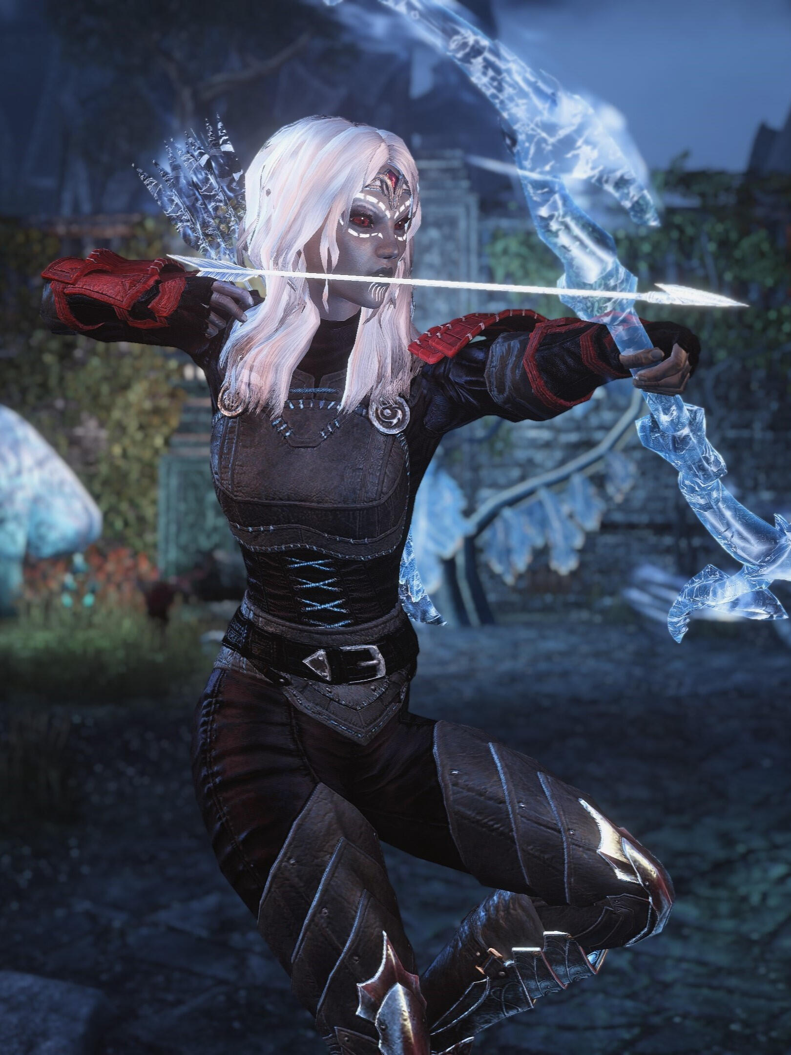 Vyvene has a lightweight and flexible suit of Netch Leather armor that doesn't hinder her movement or stamina. She had it custom tailored in Silgrad, but only later dyed the arm leather red. The boots, notably, are the only metal plating in the armor, which was supposed to also cover her shoulders and arms, but an in-progress design change to all leather left only the boots and knees adorned with Quicksilver plating.Vyvene makes use of both a Bound Bow and Bound Swords, which she can freely cast into existence at will for whatever the situation demands. Vyvene prefers using bound weapons over physical weapons both because of the weight differences and ease of use, but also accessibility, and never being without a way to defend herself where she otherwise could be disarmed.